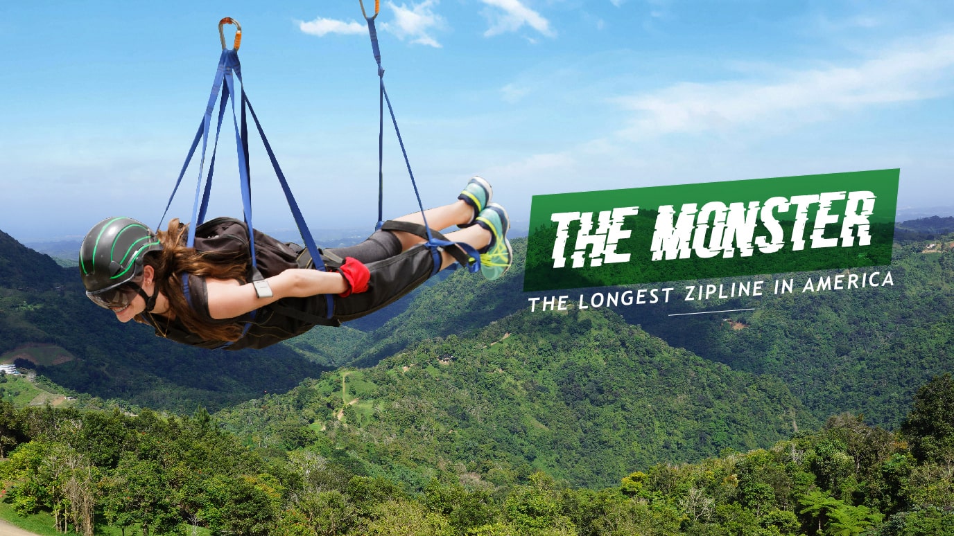 THE MONSTER: The longest zip line in America, with a 2.5km (2530m, 8300ft, 1.57mi) cable, equivalent to 28 football fields. A unique experience in the world that starts when we give you the flight equipment and then take you to the launch pad, where you finally come face to face with the scariest attraction in the Island where you will reach a speed of up 95mph, at more than 380m high.
